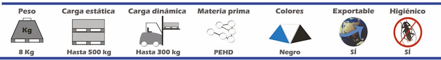 Diseñado para cargar más de 500 kilogramos, plataforma de cuatro entradas, ligero y apilable, ahorro del espacio. Ideal para las cadenas de producción, los envíos aéreos y expositores en centros comerciales.